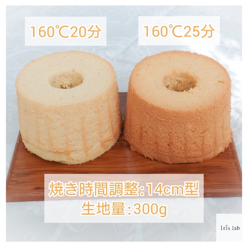 - 通常17cm型シフォンを焼く際は、160℃28分のため、今回の検証温度は160℃にしました。