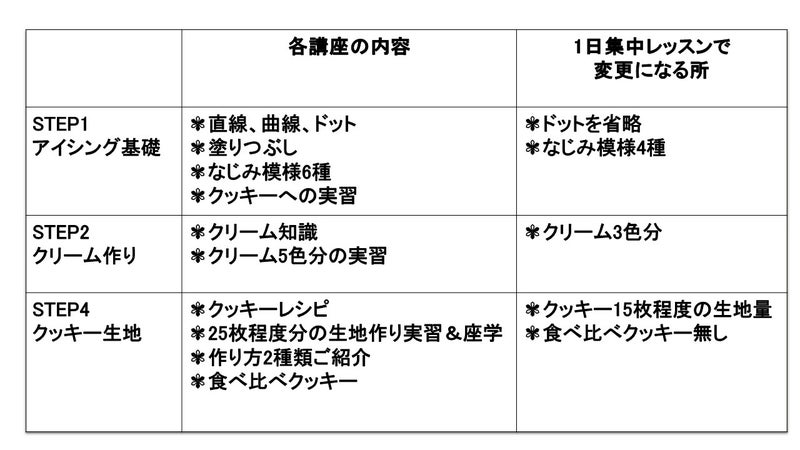 右側が「1日集中レッスン」で省略、変更になる点です。