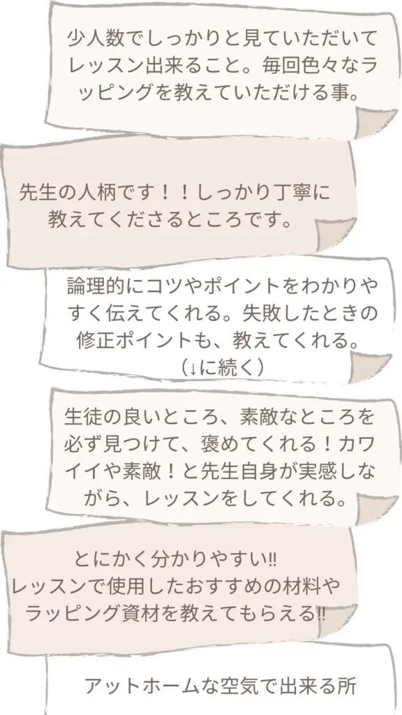 とにかく分かりやすい!!レッスンで使用したおすすめの材料やラッピング資材を教えてもらえる。