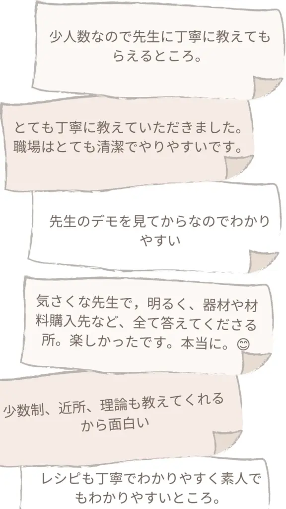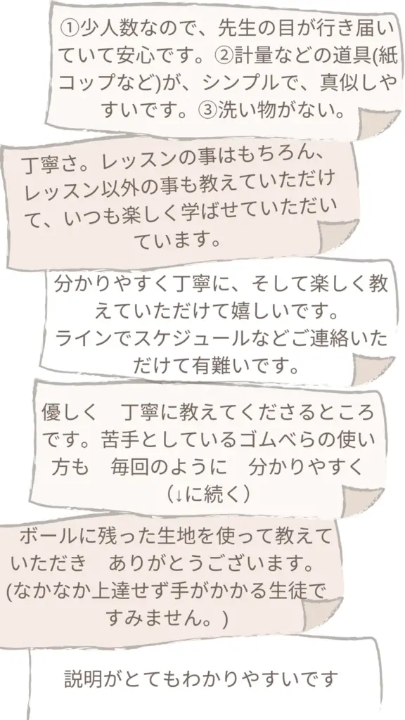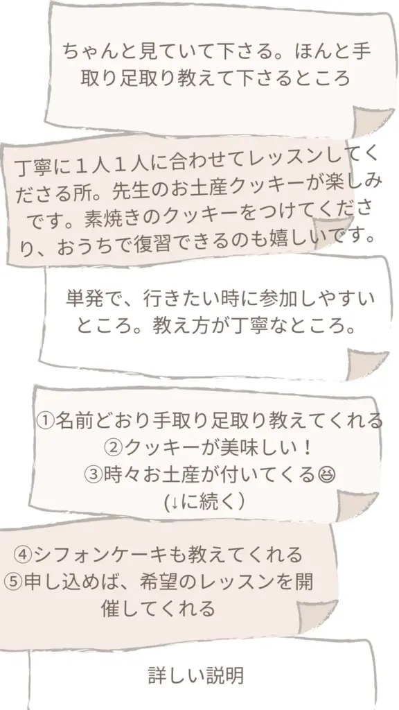 優しく、丁寧に教えてくださるところです。苦手としているゴムベラの使い方も毎回のように分かりやすく、ボールに残った生地を使って教えていただき、ありがとうございます。(なかなか上達せず手がかかる生徒ですみません。)