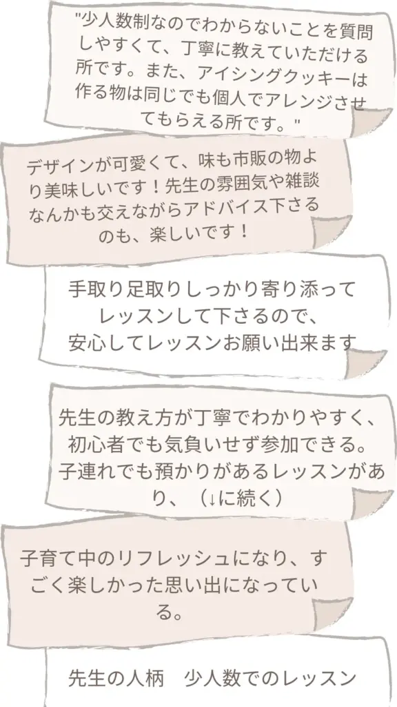 1回からでも参加できて、毎回アイシングの違う技法などが経験できるよう工夫されているところが良いです。